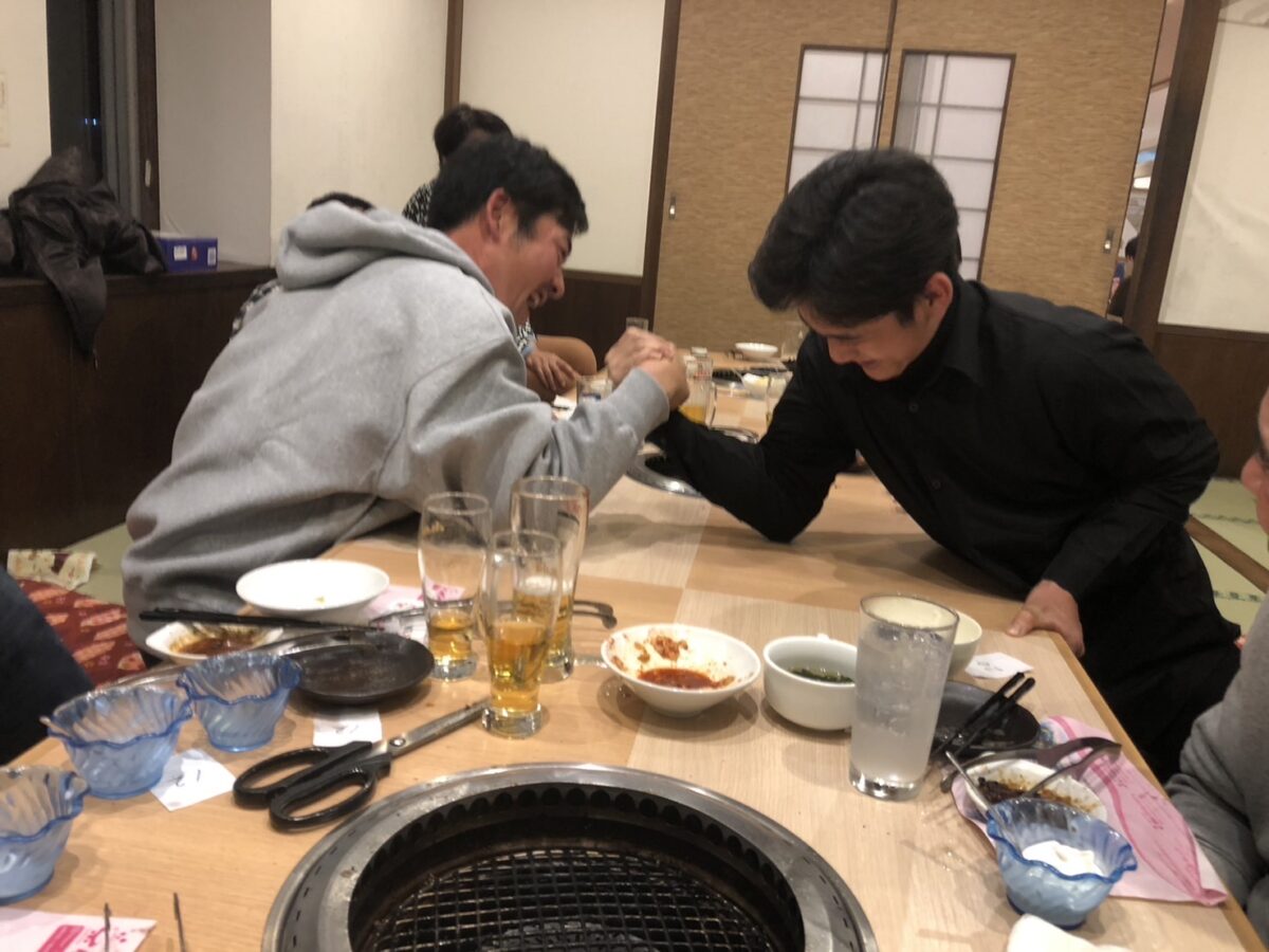 忘年会で力自慢の腕相撲!